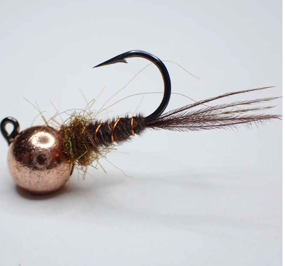Constructed on a sz10 mustad 32833 mounted with a giant 6.4mm tungsten head.