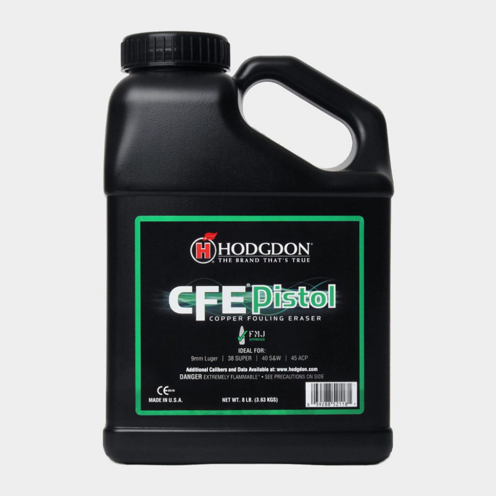 Hodgdon CFE Pistol is a spherical powder that was originally developed for US military application.Β This excellent pistol propellant utilizes the Hodgdon CFE formula, Copper Fouling Eraser, virtually eliminating copper fouling, plus providing top velocities with clean burning and minimal muzzle flash. For competitive shooters and hand loaders seeking the perfect powder for target or self-defense loads, CFE Pistol provides optimum performance in cartridges like the 9mm Luger, 38 Super, 40 S&W, the venerable 45 ACP and many more.