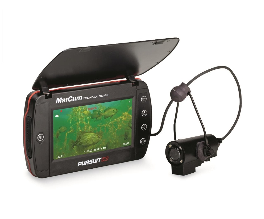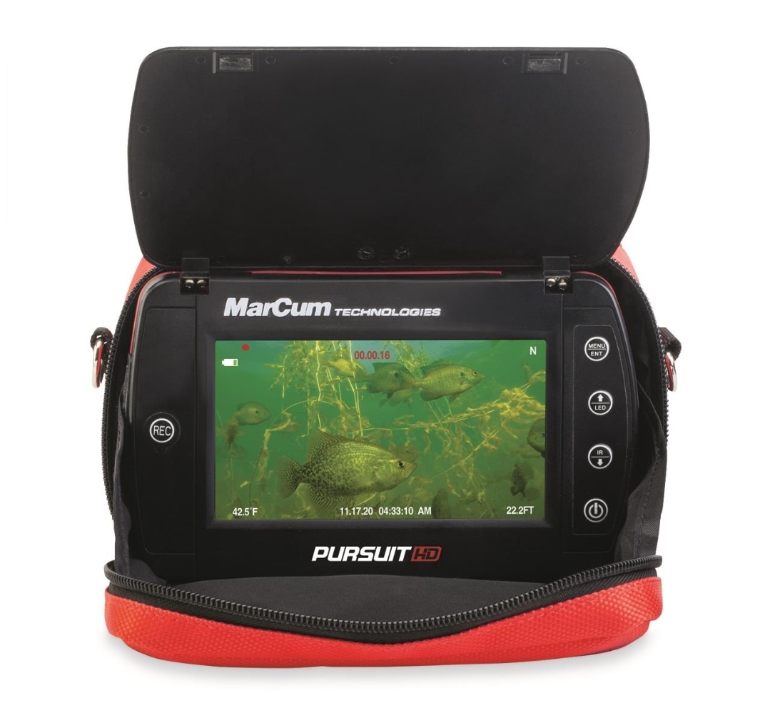 Behold the ultimate in underwater viewing. The MarCumยฎ Pursuit HD Handheld Underwater Camera sets the new standard in mobility, while still setting the standard with its technological innovations. A full 1920x1080p HD image sensor offers industry-leading display precision, while packing a punch in a pocket-sized 5″ LCD. You’ll get all the crucial on-screen details including temperature, depth, and absolute directionโalong with DVR features like MP4 capability, multiple image output sizes and cyclical recording. The image itself is so precise, it can support digital zoom, allowing anglers to gather more information on weeds or cover, fish behavior, and jigs on the far end of the wheelhouse. This all comes complete with a built-in cable reel and a convenient ยผ”-20 port at the bottom of the unit for endless mounting options. Whether you’re mobile on ice or stationery in a fish-house, the Pursuit HD L’s rich features offers best-in-class tools with the functionality to benefit all anglers. Includes Lithium battery, USB charger and cable, plus soft pack camera case.