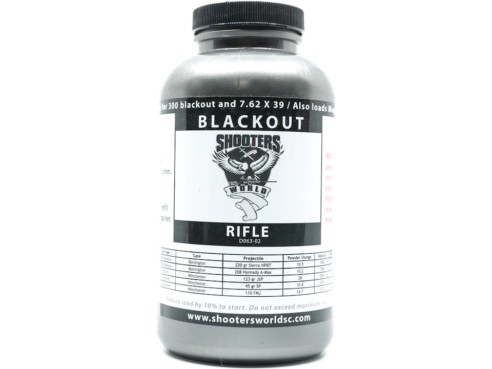 Ballistic results for Shooters World Blackout D063-02 Smokeless Gun Powder show it appropriate for both pistol and rifle cartridges that incorporate a near straight-walled cartridge